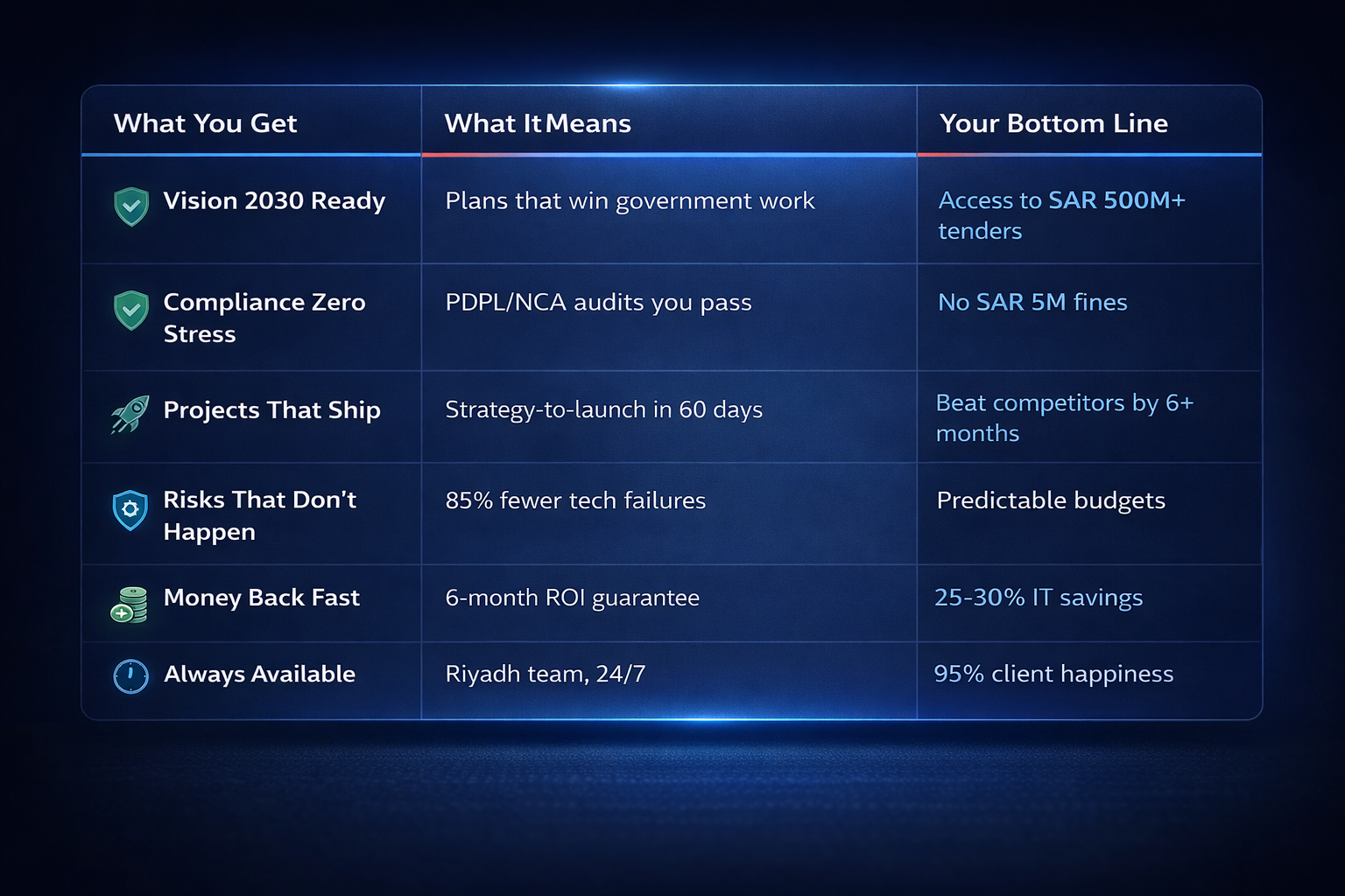 Our clients National Bank of Oman, King Khaled Eye Hospital, Air Products—trust us because we deliver. During the progress they have seen 30-40% faster projects, real cost savings, and strategies that actually work. We go with just actionable plans with measurable results.